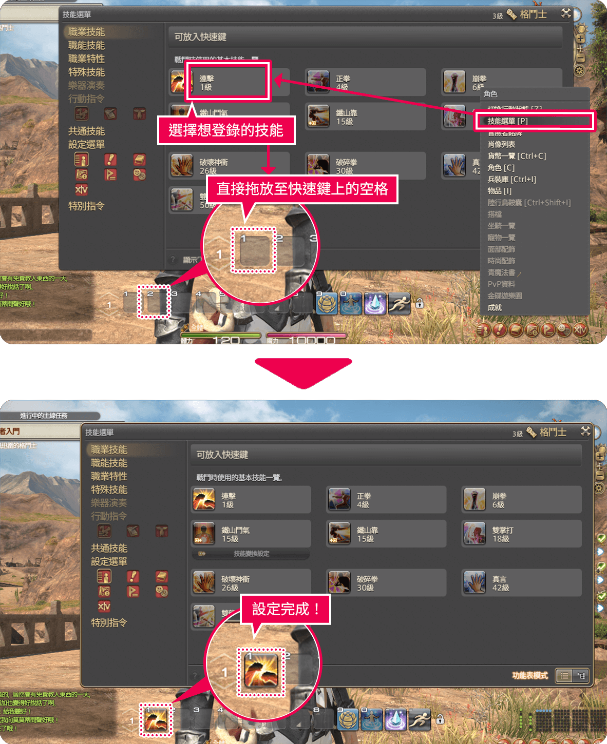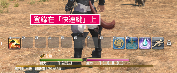 從主選單>角色>技能選單,選擇想登錄的技能,然後直接拖放至快速鍵上的空格,即可把技能登錄到快速鍵上。
