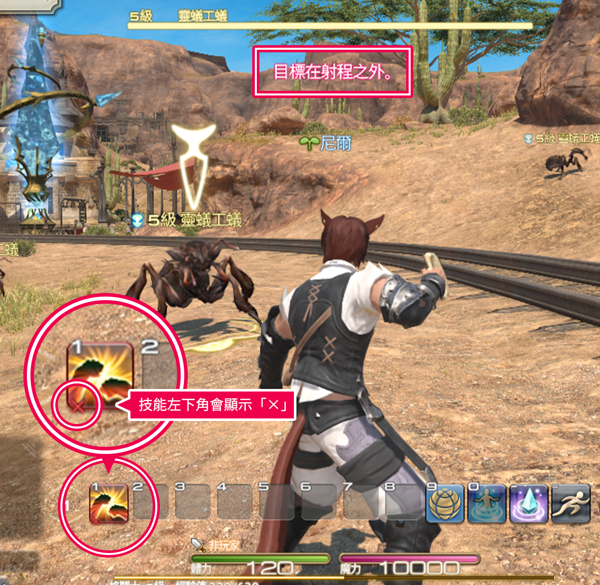每個技能都有有效攻擊範圍,若鎖定的敵人在範圍外,就無法攻擊。若想使用的技能圖示左下出現紅色「×」,代表距離太遠,請先拉近距離再使用,直到熟悉各技能的有效範圍。