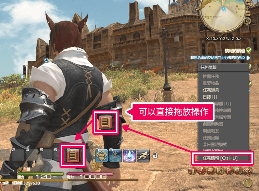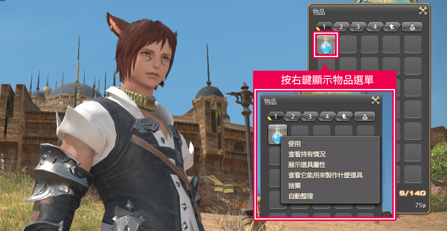 從主選單>角色>物品,選擇想登錄的道具,同樣直接拖放至快速鍵上就能完成登錄。