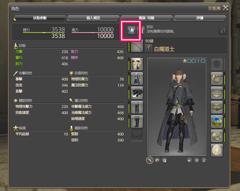 進入 角色>角色【C】(預設快捷鍵為C),就能查看「角色詳細資訊」,可以看到目前的各項資訊和裝備。
