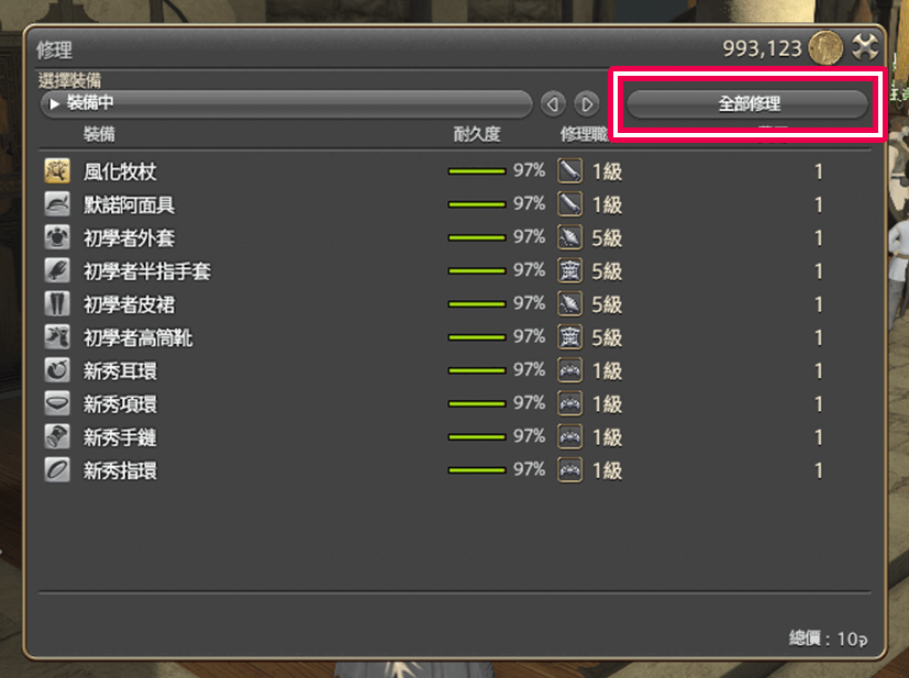 修理需要Gil,選擇「全部修理」可一次為身上所有裝備修理。