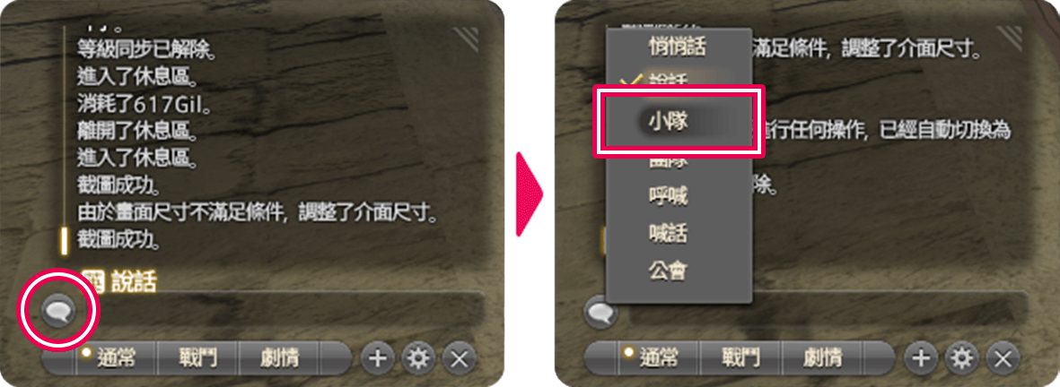 雖然要用到聊天功能,但不需要自行輸入文字,只靠按鍵操作就能輕鬆發送問候。首先用滑鼠點選聊天欄旁的對話泡泡圖示,然後選擇「小隊」。
