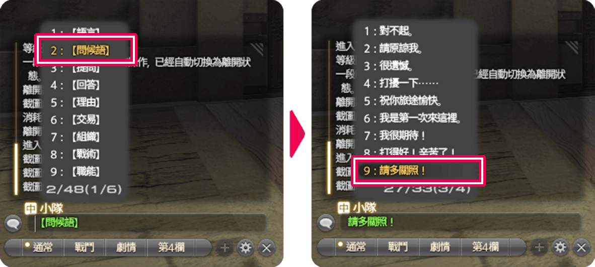 選擇 2:【問候語】>9:「請多關照!」最適合作為進入副本時的溝通。