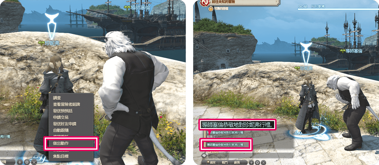 使用時,先點選對象,再從右鍵的子選單、快速鍵或動作列表中選擇「行禮」。表情會在聊天記錄中顯示。