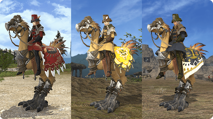 陸行鳥裝甲的設計樣式(從左至右:黑渦團、雙蛇黨、不滅隊)