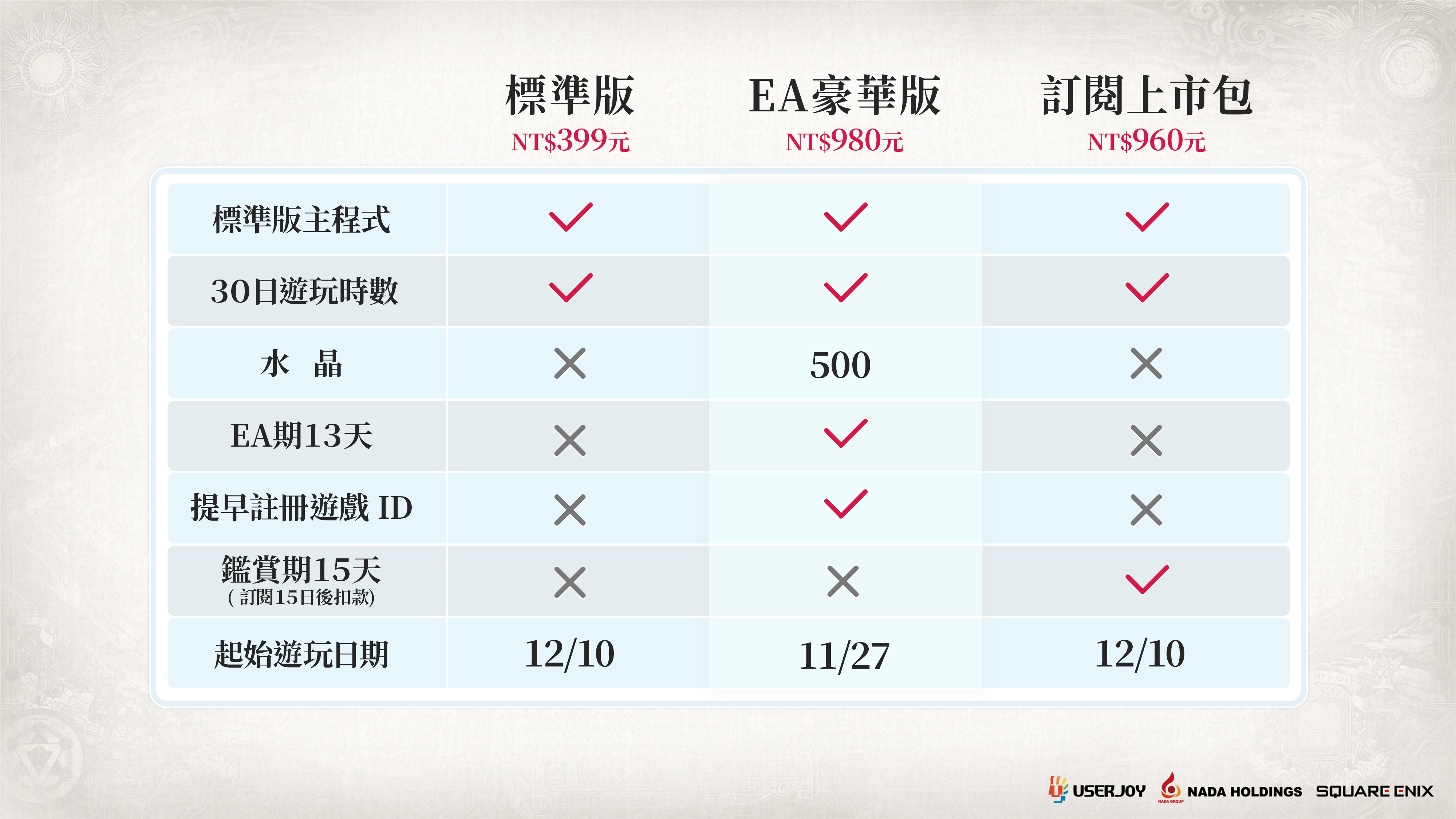 ※EA指的是Early Access 搶先體驗,購買豪華版、白金版、終極版的玩家擁有搶先體驗資格