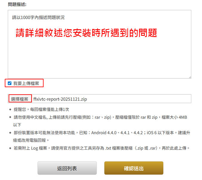 9.在回報客服時勾選【我要上傳檔案】,並點擊【選擇檔案】