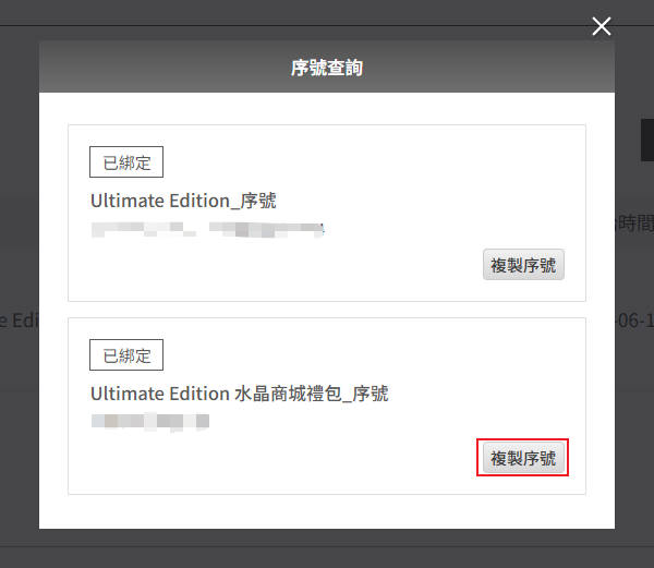 輸入您當初購買獲得的水晶商城序號,獲得相關虛寶